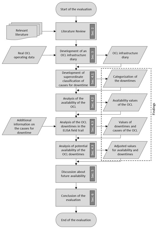 In order to prepare a systematic analysis of availability, our first step was to develop a superordinate classification of causes of downtime. An important pillar of our research is our intensively, carefully waged OCL infrastructure diary. This OCL infrastructure diary includes the exact times during which the OCL system was switched on or off and thus the times of energy supply and the downtimes. The necessary data were collected in a data logger in the system’s substation and can be retrieved as a csv file. In the event of a downtime, we documented the cause and sorted it into the corresponding category. For this purpose, we obtained additional information on the cause of the downtime from the OCL system operator. We determined the downtime’s duration, depending on the OCL scheduled operating time. In the ELISA Project, we defined two operation periods, which we consider in this paper as follows: