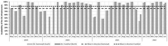 First, we analyzed availability using statistical characteristics. The monthly evaluation of availability indicates that in some months, the OCL system could barely or not be used in a certain direction of travel (see Figure 2): on average, the availability values of the OCL system were 79.2% in the southbound direction and 86.16% in the northbound direction. As the separate directional switching of the OCL infrastructure was not set up until mid-February 2020, values in the two directions of travel showed the same numbers.