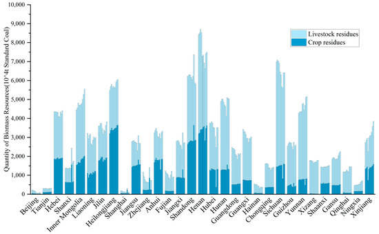 From 2013 to 2022, the overall biomass resources of agricultural and livestock residues in China showed a fluctuating upward trend. The distribution indicates that the resources are more abundant in the north than the south and in the west than the east, mainly concentrated in China’s major grain cultivation areas and pastoral areas. The northeastern provinces exhibited higher crop residue biomass resources. Meanwhile, Sichuan Province and Inner Mongolia Autonomous Region showed increasingly prominent livestock residue biomass resources.