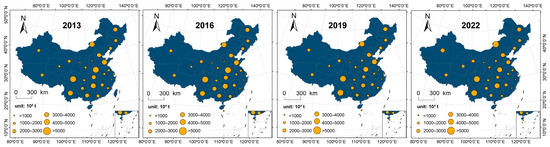 Figure 3 shows the statistical data for selected years, that is, 2013, 2016, 2019, and 2022. The calculation and statistical analysis of biomass resources from animal husbandry residues over the past decade reveal that theoretical collectible amounts showed fluctuating declining trends in seventeen provinces and municipalities, including Beijing, Tianjin, Liaoning, Shanghai, Jiangsu, Zhejiang, Anhui, Fujian, Jiangxi, Shandong, Henan, Hubei, Guangdong, Guangxi Zhuang Autonomous Region, Hainan, Chongqing, and Sichuan, with a relatively small decrease. In contrast, the theoretical collectible amounts in other provinces showed fluctuating upward trends, with significant increases in agro-pastoral transitional zones, including the Inner Mongolia Autonomous Region. China is the world’s largest livestock producer [36], with an extended livestock industry chain leading to increased value-added and growth in livestock numbers in pastoral areas.