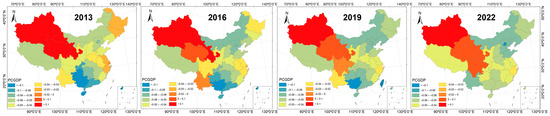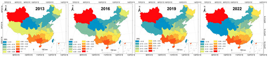 Figure 4 shows the spatial distribution of PCGDP regression coefficients. PCGDP showed a positive correlation with the distribution of biomass resources in Xinjiang, Gansu, and Qinghai, with no significant effect. Meanwhile, it showed a negative correlation in other provinces. PCGDP had a greater impact in the northwest region compared to other provinces. With economic development, the sparse population and vast land in the northwest reflect the level of agricultural mechanization, leading to increased recyclable agricultural waste in the region. The high economic development in southeastern China, with a large urban area and a smaller PPI [39], reflects higher agricultural technology in terms of improved farming efficiency and reduced agricultural waste. Therefore, in economically developed areas, GDP development tended to inhibit biomass resources. The decreasing absolute values of PCGDP regression coefficients in 2016, 2019, and 2022 indicate that the economic impact on biomass resources is diminishing.