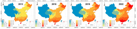 Figure 6 shows the spatial distribution of AMQ regression coefficients. From 2013 to 2022, AMQ’s impact on the distribution of biomass resources showed a positive correlation. The level of mechanization promotes agricultural development, thereby increasing biomass resources. The impact was more significant in the northeast, southwest, and southeast regions compared to the northwest, correlating with urban economic and technological development levels. The increasing values of AMQ regression coefficients in 2016, 2019, and 2022 indicate the growing influence of mechanization on agriculture [41].