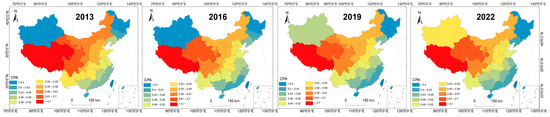 Figure 7 shows the spatial distribution of CPA regression coefficients. CPA shows a positive and significant correlation with the distribution of biomass resources. Currently, globally, biomass energy industrialization is driven by crops such as wheat and corn. Therefore, the crop planting area directly impacts biomass resources, with a greater influence in the western regions than in the eastern regions. The main reason is that the eastern part of China is currently focused on industrial and high-tech development. Due to favorable hydrothermal conditions, agricultural production costs are lower compared to the northwest region, where the land is vast and sparsely populated. In recent years, the “Western Development” [42] policy support and improvement in agricultural levels have substantially increased the scale of agricultural development, thereby providing more raw materials for biomass resource use.