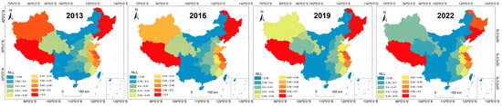 Figure 8 shows the spatial distribution of NLL regression coefficients. There is a significant and positive correlation between NLL and the biomass resource distribution. The technology for converting livestock manure into biogas is well-developed [43], making livestock numbers a direct source of biomass energy. This impact is particularly pronounced in Xinjiang, Tibet, Northeast China, and Jiangsu–Zhejiang, where NLL’s influence on biomass is more significant compared to other provinces. In Jiangsu and Zhejiang regions, there is an increasing correlation trend, potentially due to their relatively high level of biogas development and use. Xinjiang shows a stable high correlation, attributed to its developed animal husbandry. Therefore, livestock manure [44] will continue to be an important biomass resource with considerable development potential.