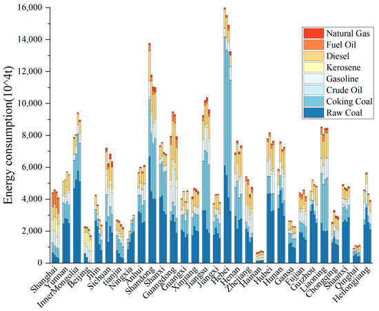 According to the China Energy Yearbook (2013–2022), statistics on provincial energy consumption (Figure 9) reveal that China’s consumption of raw coal and coking coal is high, followed by gasoline and natural gas. Meanwhile, the consumption of crude oil and fuel oil is relatively low compared to other traditional energy types. Spatially, energy consumption was higher in northern regions than in southern regions and higher in eastern regions than in western regions. Coastal provinces along the Bohai Sea exhibited higher consumption of traditional energy sources.