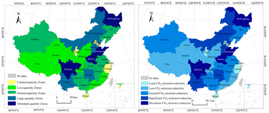 Since 2012, China’s modern agricultural ecology has entered an innovative promotion stage [45]. By analyzing the average statistics of agricultural residual biomass resources from 2013 to 2022, we used ArcGIS10.8 software and a natural breakpoint classification method to form five categories of agricultural residual biomass energy emission reduction potential zones as shown in Figure 10 (left). The specific zoning results were as follows. Regions with abundant resources included Inner Mongolia, Heilongjiang, Shandong, Henan, and Sichuan. Relatively abundant resources included Hebei, Yunnan, and Hunan. Moderately abundant resources included Xinjiang, Tibet, Jilin, Liaoning, Gansu, Jiangsu, Anhui, Jiangxi, Hubei, Guizhou, and Guangxi. Limited resources included Shaanxi, Shanxi, Chongqing, Qinghai, Fujian, and Guangdong. Scarce resources included Beijing, Tianjin, Ningxia, Zhejiang, Shanghai, and Hainan.
