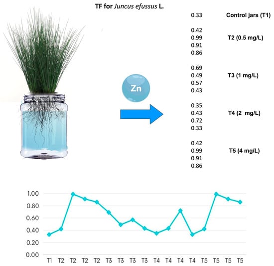 - Mateos-Naranjo, E.; Castellanos, E.M.; Perez-Martin, A. Zinc tolerance and accumulation in the halophytic species Juncus acutus. Environ. Exp. Bot. 2014, 100, 114–121. [Google Scholar] [CrossRef]
