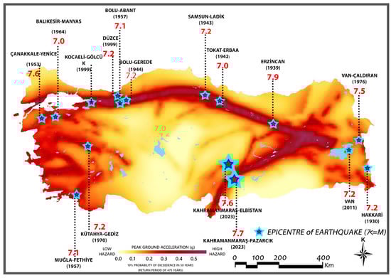 Türkiye, which is located in a very high-risk geographical area in terms of seismicity, has been affected by major earthquakes that have caused great destruction throughout the historical process. Earthquakes with a magnitude greater than 7 in the country are shown in Figure 2.