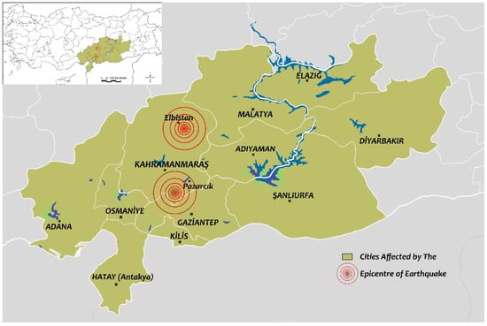 On 6 February 2023, at 04:17 and 13:24 Türkiye time, two independent and very devastating seismic events of magnitude Mw = 7.7 and Mw = 7.6 occurred, with epicenters in the Pazarcık and Elbistan district of Kahramanmaraş. While the depth of the initial earthquake was 8.6 km, the depth of the subsequent earthquake was 7 km and both earthquakes were very close to the surface. While the aftershock activity of these two independent earthquake pairs continued, another “triggered” earthquake with a magnitude of Mw = 6.4 occurred in Yayladağı (Hatay) on 20 February 2023. Unlike other earthquakes that occurred in the country, both earthquakes had significant effects on a very wide region. The earthquakes were felt very strongly and caused loss of life and heavy damage in 11 different cities, especially Kahramanmaraş, Adıyaman, and Hatay cities, as well as Elazığ, Şanlıurfa, Osmaniye, Adana, Diyarbakır, Kilis, Gaziantep, and Malatya. These 11 different settlements affected by the earthquake are shown on the map in Figure 3.