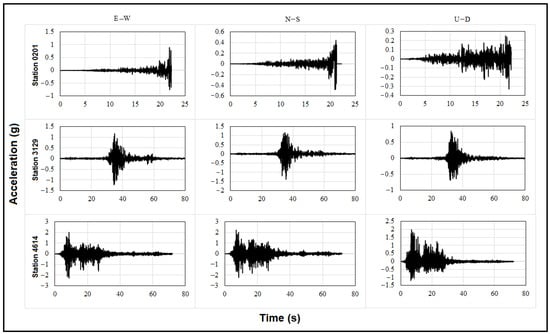 Acceleration-time graphs of the stations with peak ground acceleration (PGA) values for the provinces of Adıyaman (0201 station), Hatay (3129 station), and Kahramanmaraş (4614) in the first earthquake, whose epicenter was at Pazarcık, are shown in Figure 4. E–W, N–S, and U–D acceleration spectra and the representation according to different probabilities of exceedance are shown in Figure 5. Comparisons were made taking into account four different earthquake ground motion levels currently specified in the seismic design code in Türkiye. While the largest earthquake with a recurrence period of 2475 is expressed as DD-1, the standard design ground motion level with a recurrence period of 475 is expressed as DD-2. The remaining two earthquakes are called frequent and service earthquakes with ground motion levels and are shown as DD-3 and DD-4. In this study, the design spectrum obtained for DD-1 and DD-2 was used in comparisons. Among the horizontal acceleration values of the station, the E–W component exceeded the DD-1 and DD-2 design acceleration spectrum values, and N–S exceeded the DD-2 design acceleration spectrum value. Likewise, vertical acceleration spectrum values exceeded DD-2 design acceleration values. Spectrum acceleration values of both horizontal and vertical acceleration records at stations 4614 and 3129 exceeded the DD-1 and DD-2 design acceleration and the spectrum values.