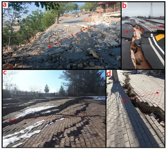 Local soil conditions directly affected the earthquake performance and structural damage levels of buildings in the Kahramanmaraş earthquakes, like in other major earthquakes. As a result of field assessments, ground-related structural damage was frequently observed, especially in settlements such as the Gölbaşı district of Adıyaman province, Kahramanmaraş (Kuyumcular and Çiğli Village), Antakya and İskenderun. In addition, earthquake effects have been clearly observed on the ground surface in different ways. One of these has been lateral spreads that occurred in the ground surface. As a consequence of lateral spreading, cracks, steepness, and depressions occur. Some samples of lateral spreading are shown in Figure 6. Lateral spread towards a free face is seen in Figure 6a,c, whereas in Figure 6b,d lateral spread down gentle slopes is shown, where a free face is absent.