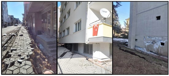 - Akar, F.; Işık, E.; Avcil, F.; Büyüksaraç, A.; Arkan, E.; İzol, R. Geotechnical and structural damages caused by the 2023 Kahramanmaraş Earthquakes in Gölbaşı (Adıyaman). Appl. Sci. 2024, 14, 2165. [Google Scholar] [CrossRef]