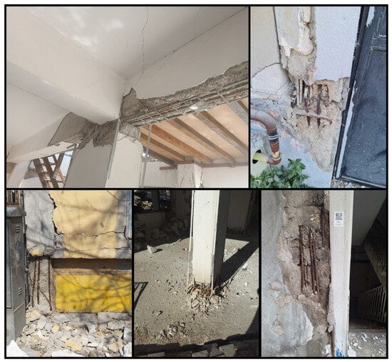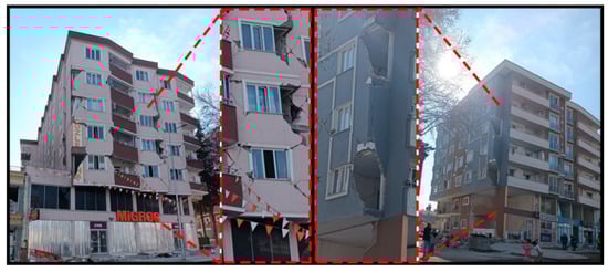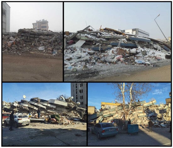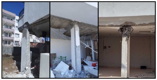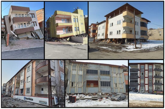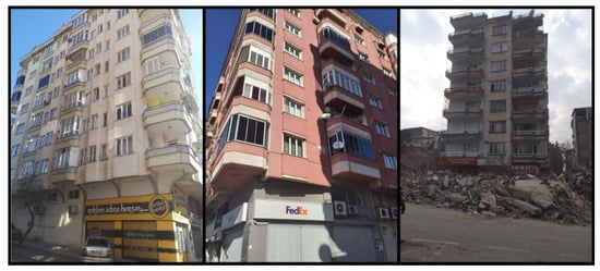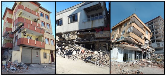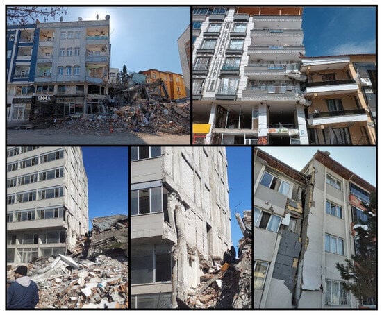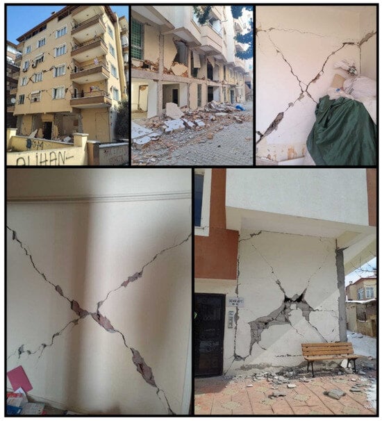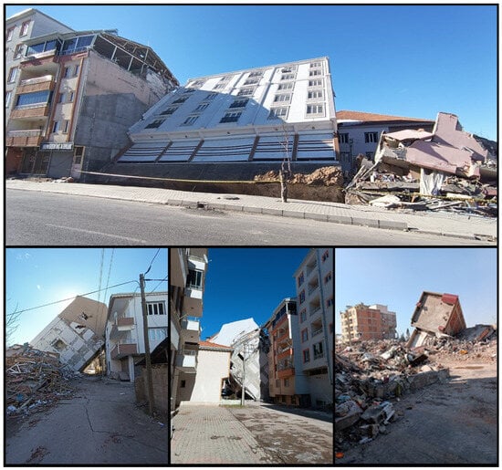 It is estimated that the total cost of earthquakes for the Turkish economy is approximately 104 billion dollars. It is also estimated that this size corresponds to approximately 9% of the national income for 2023 [1]. It has been stated that 55% of this is due to housing damage, 13% to the destruction in public infrastructure and service buildings, and 13% to private sector damage excluding housing [1]. Among the earthquakes that occurred in Türkiye this century, these were the largest in terms of human and economic losses. Determining building damage after an earthquake is significant in terms of continuing social life, determining the earthquake hazard for specific settlements, and developing codes regarding structures. The data to be collected are very valuable for the development of civil and earthquake engineering after earthquakes. Damage evaluations to be made during this process should be completed as quickly and practically as possible. There are many studies evaluating post-earthquake structural damage in this way [2,3,4,5,6,7]. In this study, observational damage assessments and evaluations were made for reinforced concrete (RC) buildings by the authors in the earthquake region. These and related post-earthquake studies are all regarded as case studies that have the potential to significantly impact academia and practice. Many studies have been conducted after each earthquake in various parts of the world regarding the effects of earthquakes on structures. Arslan and Korkmaz [8] studied the effects of disasters in Türkiye on reinforced concrete structures within the scope of the earthquake regulations used in the country. Furtado et al. [9] examined the seismic behavior of reinforced concrete structures with infill walls in light of current earthquakes. Maeda et al. (2012) [10] investigated the structural failures that occurred in reinforced concrete structures after the 2011 Eastern Japan earthquakes. Kaplan et al. [11] evaluated the damage in reinforced concrete and masonry structures as a result of their field observations following the 2009 L’Aquila (Italy) earthquakes. Işık et al. [12] evaluated the damage to reinforced concrete structures after the 2011 Van earthquake and made an example web-based application for determination of damage. Kaplan et al. [13] examined the post-earthquake of the 2003 Bingöl (Türkiye) damages to reinforced concrete buildings. Arslan [14] tried to determine the main design parameters affecting the earthquake performance of reinforced concrete buildings with artificial neural networks. Ruiz-Pinilla et al. [15] revealed the lessons to be learned from the damage to reinforced concrete structures after the 2011 Spain earthquake. Braga et al. [16] evaluated the damage to non-structural elements in reinforced concrete structures after the 2009 Italian earthquake. Valente and Milani [17] made reinforcement recommendations to increase the earthquake performance of reinforced concrete buildings. Masi et al. [18] evaluated the damage occurring to structural and non-structural members in reinforced concrete structures after the 2016 Italy earthquake. Damcı et al. [19] evaluated the structural damage in buildings with different structural systems after the 2011 Van earthquake. Çağlar et al. [20] evaluated the damage assessments resulting from the 2020 Elazığ earthquake as a result of field observations.
