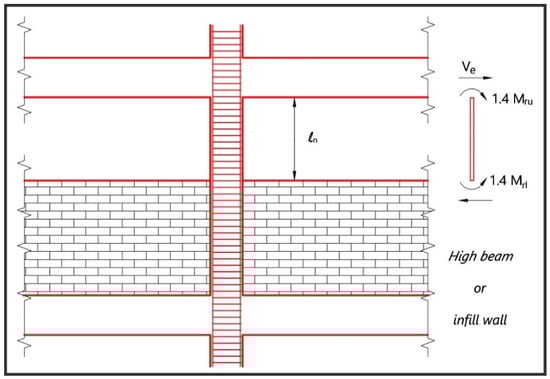 In this equation, Mrl denotes the column lower-end moment and Mru denotes the column upper-end moment. Bending moments will be calculated as Ml ≈ Mrl1.4 and Mu ≈ 1.4 Mru at the lower and upper ends of the short column, ln will be taken as the free length of the short column and the calculated shear force must meet the conditions given below;