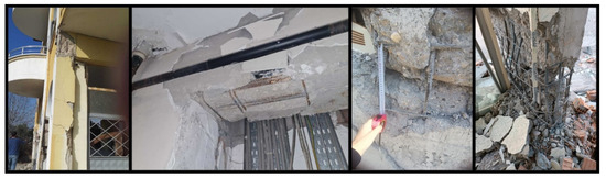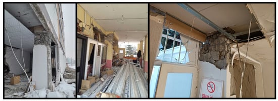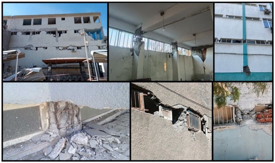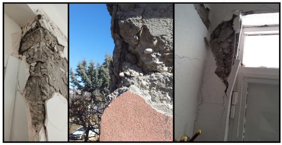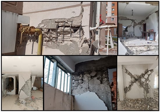 Various levels of damage have also occurred in the infill walls used to delimit and separate spaces in reinforced concrete structures. In general, the low mechanical properties of wall materials, which are given an aesthetic appearance by using gypsum plaster without the use of lime–cement plaster, as well as poor masonry work, have negatively affected the structural damage occurring in these elements. Some examples of damage encountered in infill walls are shown in Figure 14. This damage was generally observed as shear cracks and out-of-plane failure.