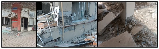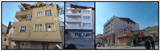 The cause of failure observed in most of the structures that were subjected to complete collapse in the earthquake zone was the soft story. In these buildings, especially those located on main streets, the ground floor is generally used as a commercial enterprise, while the upper floors are used for residential purposes. The amount of infill wall varies due to the change in purpose of use. In this case, complete collapse occurred as the upper floors of the building collapsed onto the soft story. Sample buildings that partially or totally collapsed and became unusable as a consequence of the soft ground story are shown in Figure 10.