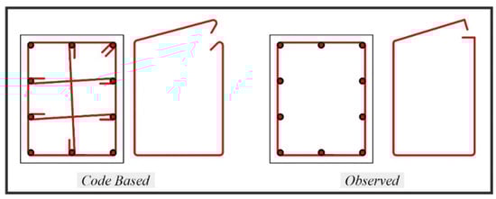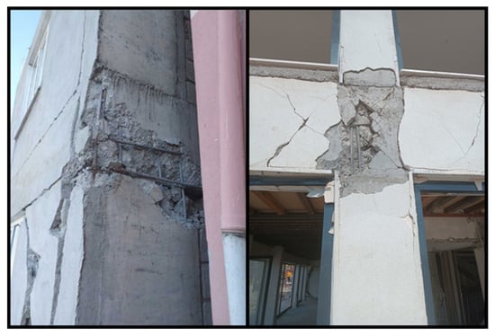 One of the roles expected from transverse reinforcement is to reduce the brittle feature of the core concrete. Transverse reinforcements fulfill this function by confining the core concrete. Insufficient adherence between concrete with reinforcement and low-strength concrete caused the core concrete to be completely crushed. Examples of such structural damage are illustrated in Figure 23.