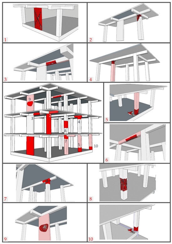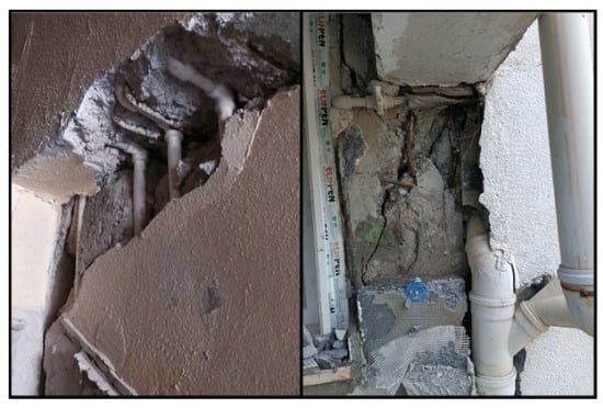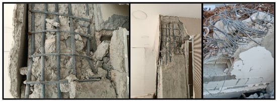 Another cause of damage is crushing damage to the concrete as a result of not using sufficient reinforcement in the column–beam connection. Failure to pay due attention to the embedment and addition of reinforcement, which was not used in sufficient quantities, caused damage in these areas, and examples of such failure are shown in Figure 26.