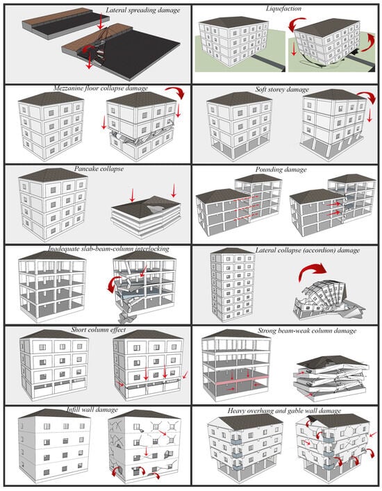 In Figure 8, such damage is displayed. Additionally, insufficient foundation depth and weak design of structure–soil interaction are other factors that contribute to such damages.