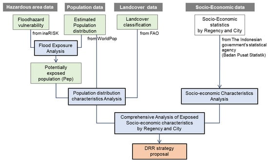 Three analyses were performed, as indicated by the blue boxes in the outlined figure. Flood exposure analysis analyzed the distribution of the population living in areas at risk of potential flood inundation, where flood vulnerability was obtained from the risk mapping analysis using inaRISK. Sigit et al. [7] used the inaRISK flood hazard vulnerability map [2], which is the natural disaster risk information published by the Indonesian government, as hazard information and combined it with open data on the estimated population distribution [17] to obtain the following information on potential disasters: the authors defined the potentially exposed population (Pep) as the value obtained by multiplying the number of residents per population distribution pixel (population per pixel, Ppp) by the risk value (0–1) presented in the inaRISK vulnerability map. In this study, we used the same definition. We treated the value of Pep aggregated by the administrative division divided by the total population of the administrative division as the exposure rate, Rexp.