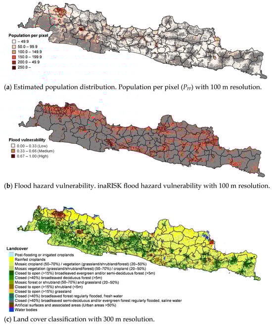 Sigit et al. [7] proposed a simple method for assessing the population’s potential for exposure to flood hazards by multiplying the inaRISK flood hazard vulnerability value by the resident population. The same method was used in this study. Maps of the flood disaster vulnerability assessment results from the inaRISK geospatial database were used as information on potential flood-hazardous areas. The results of the vulnerability assessment for flooding were expressed as a 0–1 value for each grid in the raster data, with higher numbers indicating greater vulnerability. We defined the potentially exposed population (Pep) by multiplying the vulnerability assessment values (ranging from 0 to 1) for each pixel by the estimated Ppp and aggregating them by administrative divisions. Figure 3a illustrates the distribution of Ppp in the study area, and Figure 3b displays the flood vulnerability assessment results generated by inaRISK.
