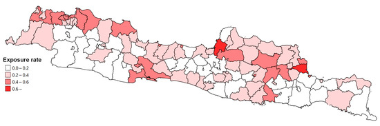Furthermore, the exposure rate Rexp is defined as shown in Equation (2). When the exposure rate for each administrative division was defined as Rexp, Rexp was defined as Pep divided by the total population, denoted as Pall. Rexp for each administrative division calculated in this study was used for comprehensive analysis.
