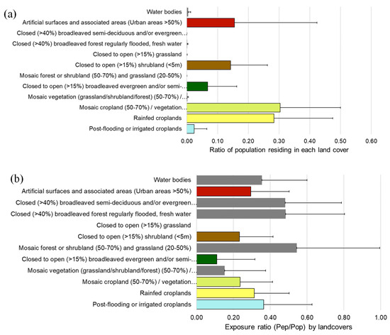 (a) Average ratio of the population residing in each land cover type; (b) average flood exposure ratio of the population residing in each land cover type. The captions are in reverse order of the landcover list in Figure 3c. Error bars indicate standard deviations for all administrative districts.