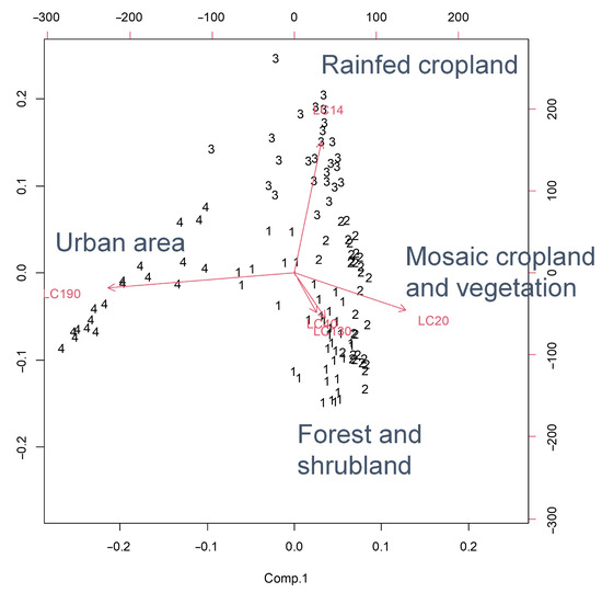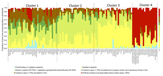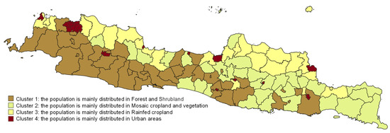 For each administrative district, a hierarchical cluster analysis was conducted using population composition by land cover type as a variable. As a result, the 114 administrative divisions were divided into four clusters. As shown in Figure 6, the characteristics of each cluster were explained by the typical land cover described earlier. Cluster 1: the population was mainly distributed in forests and shrubland; Cluster 2: the population was mainly distributed in mosaic croplands and vegetation; Cluster 3: the population was mainly distributed in rainfed croplands; and Cluster 4: the population was mainly distributed in urban areas.
