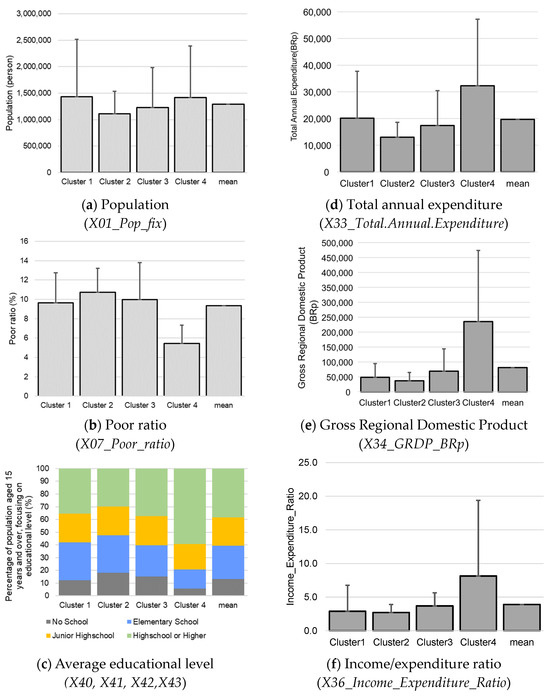 There was no significant difference in the populations for each cluster (Figure 9a). However, the poverty rate shown in Figure 9b was significantly lower for Cluster 4. The education level of the heads of households was also higher in Cluster 4 (Figure 9c). Cluster 2 had the lowest average educational level. The low level of education in Clusters 1, 2, and 3, especially in Cluster 2, may reflect the poor accessibility of educational institutions and higher education in rural areas.