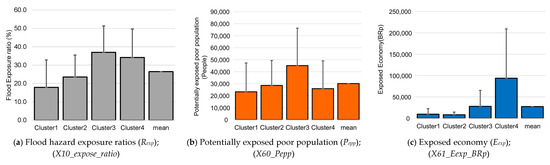 The results of the exposure ratios Rexp, potentially exposed poor population Pepp, and exposed economy Eexp evaluated based on the results of the flood hazard exposure analysis were tabulated by cluster classification and are shown in Figure 10a, Figure 10b, and Figure 10c, respectively. In Figure 9, which is compiled for socioeconomic indicators, only Cluster 4 showed different characteristics, whereas in Figure 10, which shows the exposure characteristics to flood hazards, Clusters 1–3 also showed different trends. The flood hazard Rexp was higher in Cluster 3, which was dominated by rainfed croplands, and Cluster 4, which was dominated by urban areas. Cluster 3 had the highest Pepp value, indicating that the poorest population is potentially exposed to floods.