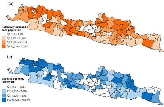 (a) Potentially exposed poor populations, (b) exposed economy. Quartiles are used to indicate the four levels.