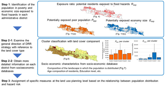 To develop effective DRR strategies that consider regional characteristics, decision-makers involved in disaster prevention and mitigation should have a common view of the characteristics of the region and features of the various strategies. The results of this study provide useful insight for this purpose. As a basis for developing a strategy for each administrative division, attention should be paid to the exposure rate (Figure 4), the poor population exposed to flood hazards, and the size of the economy (Figure 11a,b). This information provides a bird’s-eye view of the distribution of flood risk over a wide area in social and economic terms. The four cluster classifications shown in Figure 6, Figure 7 and Figure 8, which focus on the relationship between population distribution and land cover, have a clear correspondence not only with the main land cover where the population is distributed or landscape characteristics but also with socioeconomic conditions, such as poverty, education level, and income (Figure 9 and Figure 10).