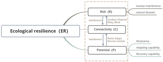 The PSR (Pressure-State-Response) model [51] and the DPSIR (Driver-Pressure-State-Impact-Response) model [52] have found widespread application in urban risk assessment, disaster prevention planning, and the formulation of ecological security frameworks [53]. Grounded in the logical underpinnings of this theoretical nexus, this study posits that ecological resilience is shaped by ecological stress risk, system connectivity, and ecosystem response potential. Leveraging this theoretical framework in conjunction with the aforementioned risk-response models, the study introduces the RCP (Risk–Connectivity–Potential) model for evaluating ecological resilience (Figure 2).