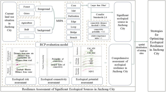 In the context of ecological civilization construction, resource-based cities (RBCs) are tasked with the dual responsibility of national energy supply and transformation amidst complex social contradictions. These cities face the resource curse dilemma, characterized by resource depletion, conflicts in spatial production, in living, and in ecological spaces, and intertwined ecological–economic–social issues. Enhancing their ecological resilience is a crucial indicator of successful transformation strategies. This study focuses on Jinzhong City in Shanxi Province, employing Morphological Spatial Pattern Analysis (MSPA) to assist in the spatial analysis of urban ecological resilience. Additionally, Conefor Sensinode is utilized to identify key ecological sources that significantly contribute to urban resilience. A novel Risk-Connectivity-Potential (RCP) model is developed to construct a framework of indicators affecting the resilience of RBCs, which is used to assess the ecological resilience of Jinzhong City, particularly in relation to the spatial distribution of mining areas. The results indicate the following: (1) important ecological source areas within the city constitute approximately 39.47% of the total city area, predominantly located in woodland regions; (2) the overall assessment of ecological resilience reveals a heterogeneous pattern, increasing from west to east, with lower resilience observed in low-lying terrains and higher resilience in mountainous plateaus; (3) mines within significant ecological source areas are primarily situated in low-resilience zones near built land and agriculture land, while other mining areas are mainly found between high-resilience zones, posing risks of increased ecological resistance, reduced ecological connectivity, and potential ecological issues. This study explores the application of the ecological resilience framework in RBCs, providing a scientific basis and reference for the rational utilization of resources and urban transformation and development.The methodology and findings can be applied to similar cities globally, offering valuable insights for balancing resource management and ecological protection in the context of sustainable urban development.