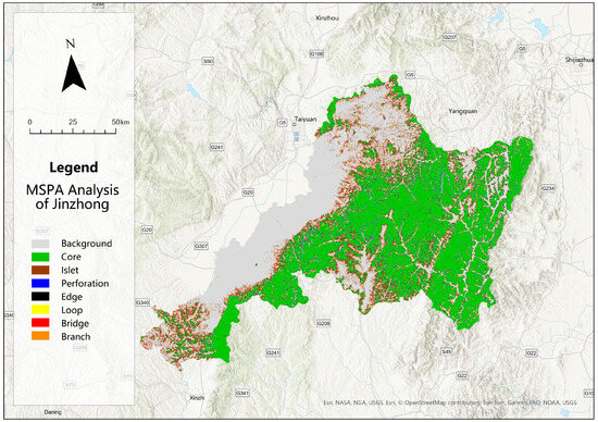 MSPA (Morphological Spatial Pattern Analysis) serves as a fundamental tool for discerning the spatial topological relationships among structural elements and target image element sets [36]. Drawing upon the current land use dynamics within Jinzhong City (Figure 1), this investigation selected woodland and grassland as foreground data, contrasting with other land uses designated as background data. Utilizing the MSPA analysis tool integrated within the Guidos toolbox, seven distinct landscape types were delineated across the study area, encompassing core, islet, perforation, edge, loop, bridge, and branch, thereby facilitating the identification of ecological source sites.