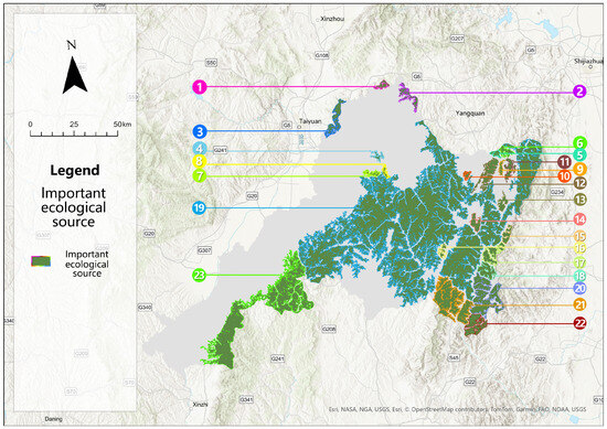 Spatial distribution of ecological sources in Jinzhong City. The Chinese characters in the figure mean Fenhe.