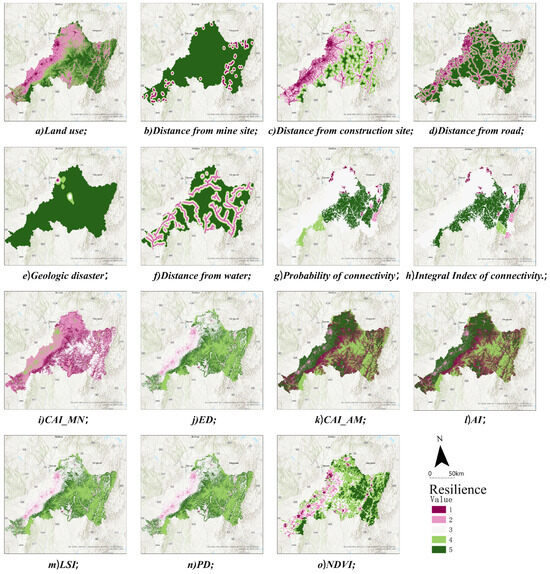 The natural breaks (Jenks) was used to categorize the evaluation results of each impact factor into five grades, with Grades 1–5 indicating the toughness level from low to high, to acquire the assessment outcomes for each metric parameter under the three criteria layer of ecological stress risk, ecosystem connectivity, and ecosystem response potential, respectively.
