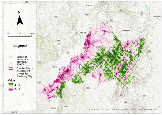 where represents the system ecological resilience index; represents the ith ecological risk influencing factor, represents the jth ecological connectivity influencing factor, and represents the kth ecological potential influencing factor; , , and represent the corresponding weights of the ecological risk, ecological connectivity, and ecological potential influencing factors, respectively. The larger the value of the system ecological resilience index, the higher the background resilience of the landscape in the region, and the stronger the ability to respond to external disturbances.