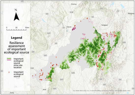 Jinzhong City exemplifies a typical resource-oriented municipality, boasting a diverse array of mineral reserves, including coal, bauxite, iron, chromite, and ilmenite [8]. The city hosts a total of 443 mining sites, dispersed across 11 counties and districts. While mineral extraction drives significant socio-economic development, it inevitably exerts adverse effects on local vegetation, particularly through the direct stripping of surface vegetation [15]. Persistent ecological challenges stemming from historical mineral extraction practices remain salient, exacerbating tensions between urban expansion, regional resource exploitation, and ecological sustainability [63]. Leveraging ArcGIS spatial analysis tools to overlay the spatial coordinates of 114 mining sites onto a resilience assessment map of critical ecological zones (Figure 8), it was determined that 44 mining operations within ecological resource accounted for 38.60% of the total mining sites. These mines are mainly concentrated in low ecological resilience zones close to the distribution of landscape types such as agriculture and built, and mines outside the ecological sources are mainly concentrated in the southwestern part of the Taiyuan Basin and between the seams of significant ecological sources in the Qinlu Plateau and Taihang Mountains.