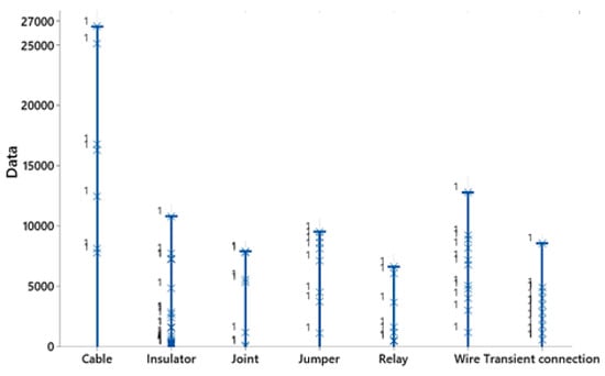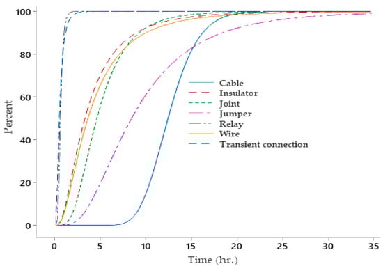 The cumulative behavior of the various power transmission network components’ failures is depicted in Figure 3. Insulators and relays have a higher failure rate in the initial stages of operation. Furthermore, there is a growing pattern of failures that center on jumpers’ time interval ends. The behavior of the other components is nearly stable, suggesting a steady state that is not subject to significant fluctuations over time.