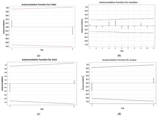 (a) Autocorrelation test for cable failure data; (b) autocorrelation test for insulator failure data; (c) autocorrelation test for joint failure data; (d) autocorrelation test for jumper failure data; (e) autocorrelation test for relay failure data; (f) autocorrelation test for wire failure data; (g) autocorrelation test for transient connection failure data.
