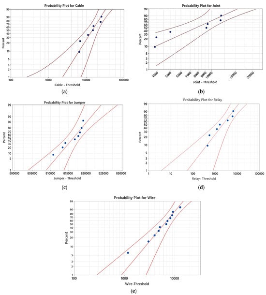 The analysis of the best-fit distributions for failure and reliability assessment included evaluating various potential models, such as normal, lognormal, logistic, Weibull, exponential, and smallest extreme value, as illustrated in Figure 5a–e. The results indicate that the three-parameter Weibull (3P-Weibull) distribution provided the best fit for cables, joints, jumpers, relays, and wires, as shown in the respective figures. This comprehensive evaluation of the various distribution models allowed for the identification of the most appropriate statistical representations for the failure and reliability characteristics of these critical power transmission network subsystems.