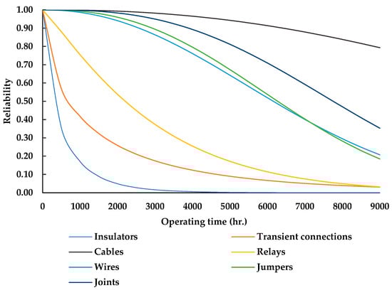 - For cables, insulators, joints, jumpers, relays, wires, and transient connections, the corresponding mean TBFs were estimated at 16179, 1386, 3997, 31078, 2895, 6473, and 3044 h.