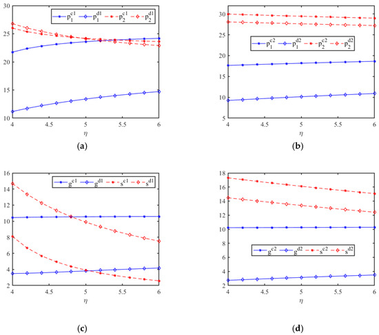 Effect of on optimal decision and profit. (a) The impact of η on the price p. (b) The impact of η on the price p. (c) The impact of η on the green input g and service input s. (d) The impact of η on the green input g and service input s. (e) The impact of η on the profit π. (f) The impact of η on the profit π.