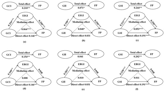 Table 4 reveals that, within the three dimensions of GSCI, only GCI () and GSI () had significant positive impacts on financial performance (FP), supporting H1b and H1c. Conversely, GII () did not significantly influence financial performance (FP) and, so, H1a was rejected. Furthermore, Table 4 indicates that all three dimensions of GSCI had significant positive effects on exploratory green innovation (ERGI) (; ; ) and exploitative green innovation (EIGI) (; ; ), supporting H2a, H2b, H3a, H3b, H4a, and H4b. However, among the two dimensions of ambidextrous green innovation, only exploitative green innovation (EIGI) () significantly influenced financial performance (FP) positively, while exploratory green innovation (ERGI) () did not. Consequently, hypothesis H5b was confirmed, whereas H5a was rejected.