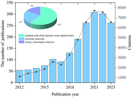 The number of publications per year serves as a valuable indicator of growth trends in seafood cold chain logistics research. Figure 1 illustrates the annual publication and citation counts of seafood cold chain logistics documents, revealing an exponential surge of publications in the seafood cold chain logistics field over the past 12 years. Despite the rapid growth of the seafood industry, comprehensive reviews of research in the field of seafood cold chain logistics are relatively scarce. Analyzing and summarizing past research is a valuable academic endeavor, as the theoretical and empirical contributions of individual studies are crucial for advancing knowledge within an academic field [33,34,35,36]. Bibliometric analysis can elucidate development trends in seafood cold chain logistics, identify research hotspots, and highlight emerging directions, thereby guiding future research choices and planning [37,38,39,40]. Although numerous researchers have reviewed various aspects of seafood cold chain logistics, such as energy consumption analysis [41], electrode materials [42,43], and route design [44,45], few have employed bibliometrics to explore research hotspots, developing trends, or scientific advancements in this field [46,47].