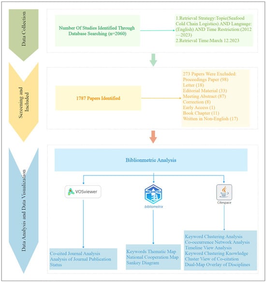 The research process is illustrated in Figure 2. In the first stage, the data required for the study were collected, and a search strategy was determined. In this study, data for bibliometric research were gathered from the CNKI, Web of Science (WOS), and Google databases. The search was conducted using the keyword “Cold Chain Logistics and Marine Products”, with a time frame from 1 January 2012 to 31 December 2023. To ensure the accuracy of the visualization results, the search data were filtered to include only articles, excluding books, conference papers, and other document types. After removing duplicate records from WOS and completing the filtering process, a total of 1787 relevant articles were obtained. Finally, bibliometric analysis was conducted. The complete records from WOS include author names, document types, Web of Science categories, keywords, publication years, publishers, affiliations, countries, and indices.