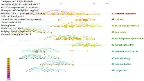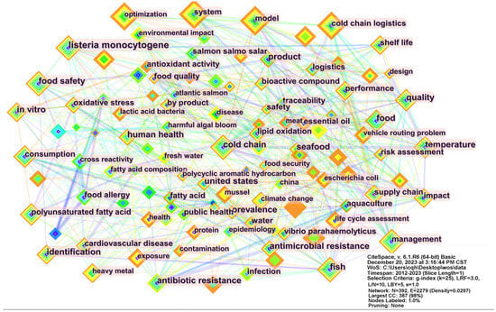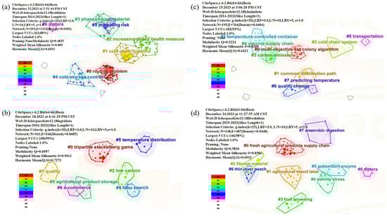 The keyword clustering map automatically extracts vocabulary through co-citation coupling analysis, generating clustering labels that objectively reflect the core topics of research in the field of seafood cold chain logistics [67].