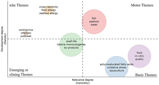 Most studies and citations on seafood cold chain logistics are focused on the seafood and aquaculture theme group. Although cross-reactivity, food allergy, and seafood allergy are considered highly advanced, they are independent topics with high centrality and low density. While the keywords in this group had a high productivity in the earlier years, their connection to the themes has weakened over time. However, terms like shelf-life, listeria-monocytogenes, and by-products belong to the emerging theme group. Keywords like food, in vitro quality, polyunsaturated fatty acids, oxidative stress, and aquaculture are basic themes with lower density and centrality. The keywords in this group have lower internal linkages.