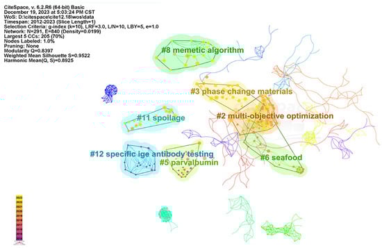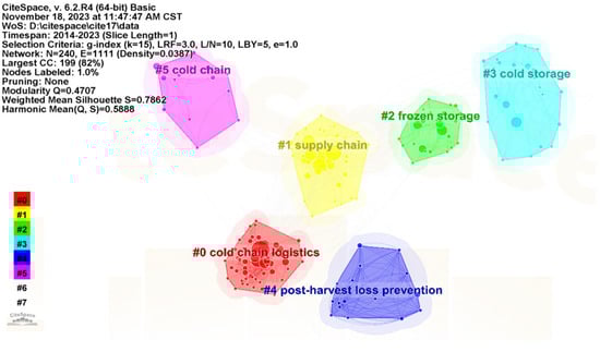 Reference co-citation refers to citing multiple studies in a paper to show their relevance and interconnection. Through the analysis of the co-citation network of references, the interrelation between the documents can be further displayed, showing the degree of disciplinary integration, improving the knowledge system, and providing ideas for scholars’ further research [73,74]. “References” were selected as the node type, and the time slice was set to one year, using the g-index (k = 3) to run the software. According to the log-likelihood ratio (LLR) function, noun phrases were extracted from the article keyword lists. From the (Figure 9), it can be seen that the modularity Q is 0.8397, which is greater than 0.3, indicating that the references in the documents are concentrated. The main clusters focus on “cold chain logistics”, “risk reduction”, “ephemeral algorithm”, and “phase change materials”.